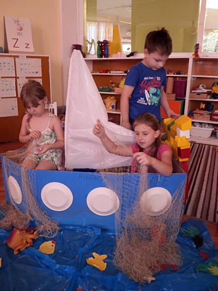 U međuvremenu smo izradili brodice od kutija za jaja, bojali ih bojama po izboru i davali im imena. Igrali smo se raznih igara: „Pecanje ribica“, „Tko će prije uloviti ribu“, slovnih igara na temu, matematičkih igara (koliko je brodića, ribica...), slagali smo puzzle i sl. Pričali smo priču „Ribica Srebrica“, „Sretni brodić“, „Zlatna ribica“ i radili smo dramatizaciju. Pripremili smo igrokaz „Dragocjeni biser“ koji smo izveli za roditelje na završnoj priredbi. Slikovno smo se izražavali na temu. Crtali smo brodove, ribarske mreže i razne vrste riba. Slikali smo na prozirnoj foliji. Cijelu godinu djeca su se igrala malim lego kockicama, njima nadograđivala kabinu, jarbole i ljubomorno čuvala napravljeno da im netko ne uništi. Ante je donio i pravu mornarsku kapu koju je svatko želio probati. Kako smo se pribrižavali toplim danima i ljetu planirane teme za ovo razdoblje odlično su se uklopile u projekt.