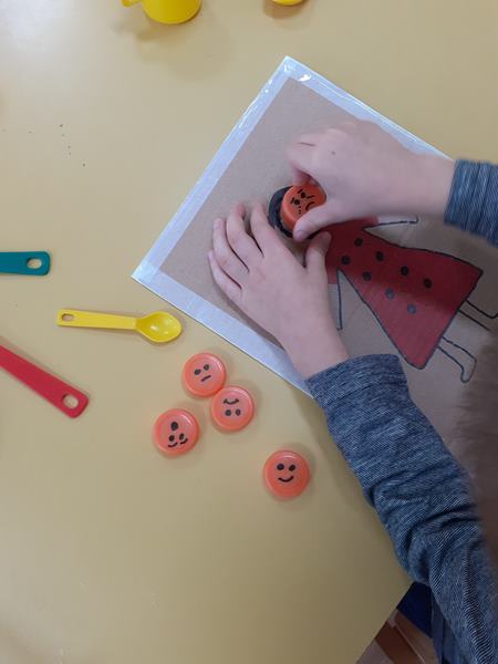 Na čepove i papir nacrtala sam različite izraze lica (sretan, tužan, ljut…), te sam na karton nacrtala lik djevojčice na koji su djeca nakon što bi ja izraz lica nacrtala na papir, djevojčici čepom pridruživali identičan izraz. Pritom sam pričala o emocijama, kada su ljudi sretni,kada tužni, zašto se ponekad ljutimo…