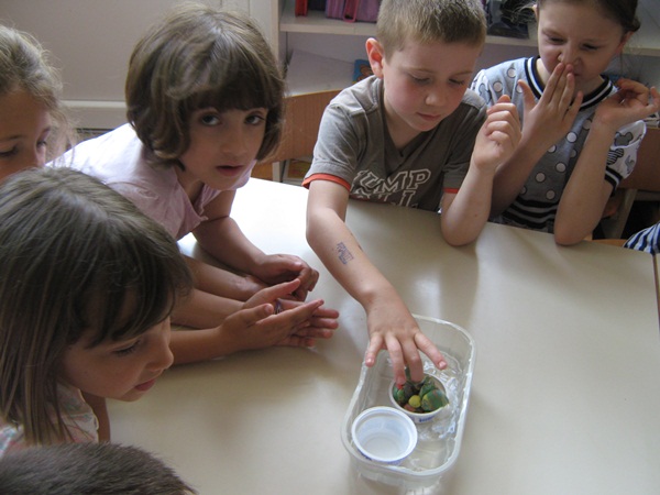 - Magična voda: vodu od ribanog crvenog kupusa ulili smo u tri čaše. U jednoj je bila čista voda, u drugu je dodana soda bikarbona, a u treću smo dodali plavu boju. Djeca su u čudu gledala što se događa: