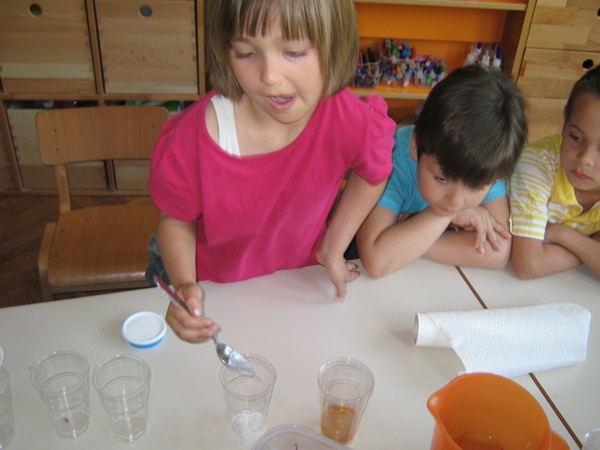 - Topivo – netopivo: različite sastojke miješali smo s vodom (šećer, sol, cedevita, zemlja...). Djeca su logički zaključivala i advala konkretne odgovore. Mia je isprobavajući topljivost šećera rekla: „Baš bih popila ovu slatku vodu.“