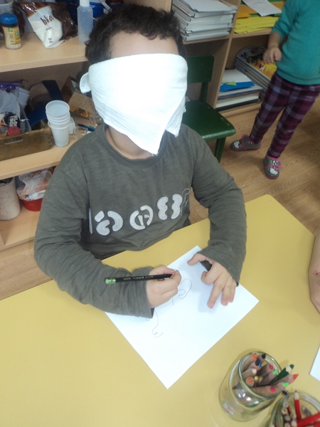 U skupini imamo dijete koje nosi naočale što nas je potaknulo na otkrivanje svijeta slabovidnih i slijepih osoba. R. se dosjetio kako mu je mama kod kuće pokazala pismo za slijepe. U vrtić je donio kutiju od sirupa na kojoj se nalazilo Brailleovo pismo. Osim širenja spoznaja o novom načinu pisanja i čitanja, djeci su bile ponuđene taktilne slikovnice. Prilikom opipavanja imali su zavezane oči s ciljem razvoja taktilne percepcije.